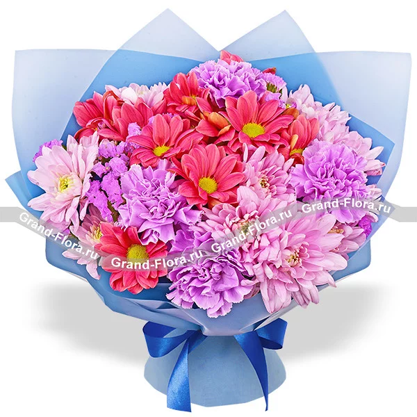 Стандартный: гвоздика фиолетовая - 4 шт., хризантема кустовая красная - 2 шт., хризантема кустовая фиолетовая - 3 шт., статица, упаковка, лента.