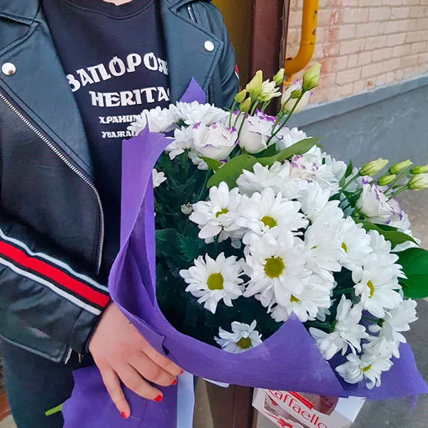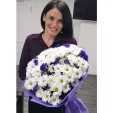Искал букет с ромашками, нигде не мог найти. Когда позвонил в службу, мне пояснили, что в это время года ромашка не поступает в магазины, но кустовые хризантемы ничем не отличаются от ромашки. Выбрал этот букет в люксовом варианте, смотрится очень достойно. Рекомендую.